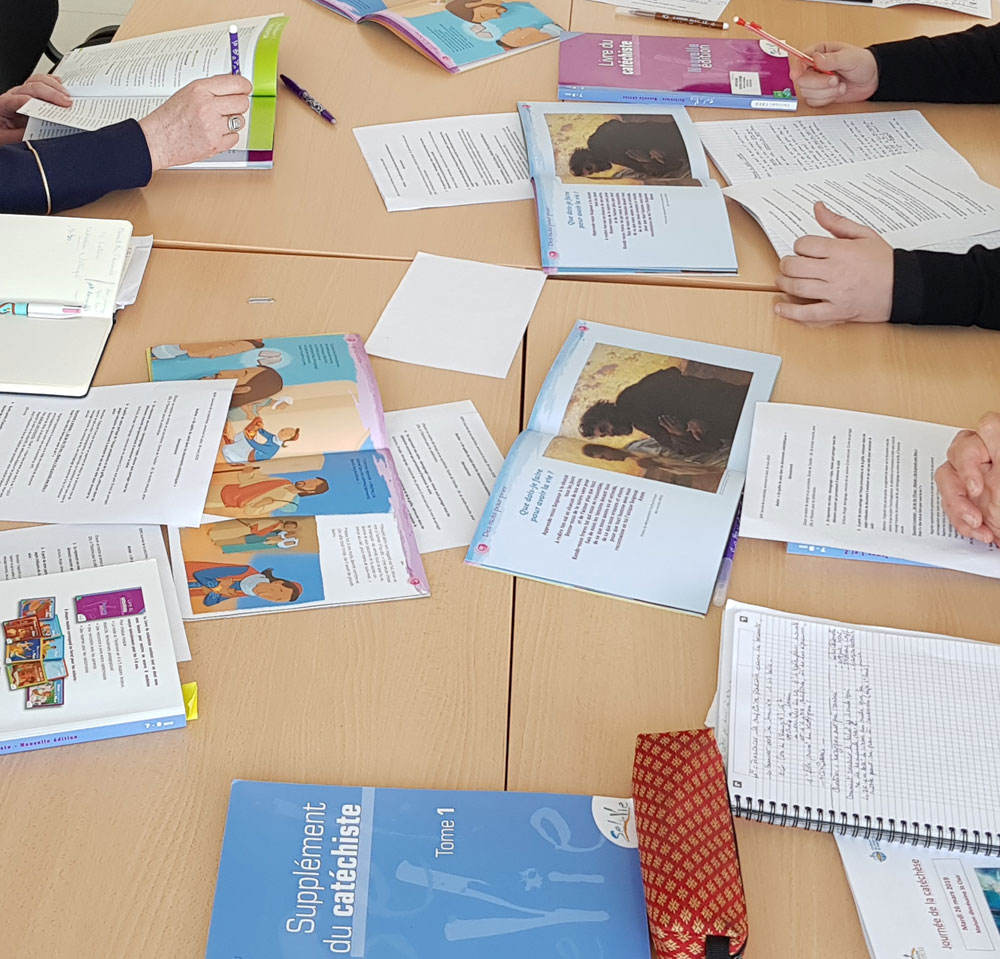 Table de travailAprès ces apports très concrets, Piettro Biaggi invite les participants à regarder dans les Écritures, une certaine posture d’annonce, celle de saint Paul qui n’a  pas connu Jésus dans sa vie publique et qui pourtant devient un apôtre zélé. La source de la motivation de Paul se situe sur le chemin de Damas, dans sa rencontre personnelle avec  le Christ. Celle-ci est essentielle pour tout catéchiste. Il faut bien sûr annoncer le kérygme (1), le cœur de la foi, mais avant de l’annoncer il faut le vivre soi-même afin d’être disciples missionnaires. En nous laissant toucher par ce kérygme nous l’actualisons et nous sommes plus à même de rejoindre les gens d’aujourd’hui dans leurs questionnements.  Il faut bien garder à l’esprit que le Ressuscité n’a pas disparu dans le ciel, mais qu’il est présent parmi nous, il l’a dit : « Je suis avec vous jusqu’à la fin des temps ». Le texte national  l’orientation de la catéchèse invite à oser l’annonce du Salut même si la personne qui reçoit cette annonce reste libre de l’accueillir. Piettro Biaggi indique alors quatre voies  possibles pour une annonce aujourd’hui :