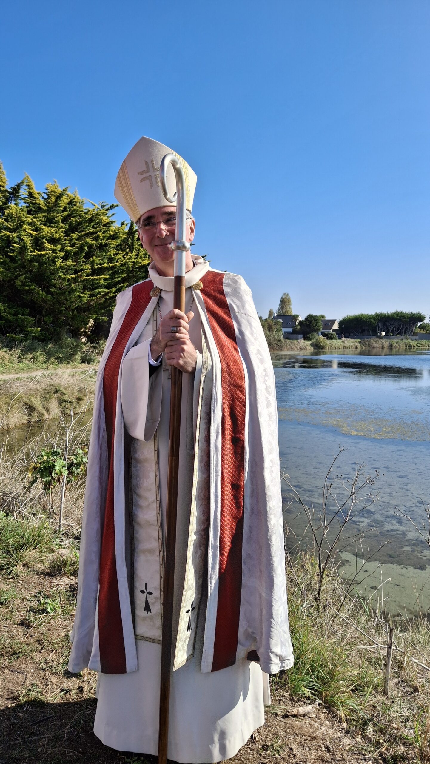 Mgr Percerou est photographié à l’endroit exact où la tradition voudrait que saint Clair ait débarqué à la fin du IIIe siècle pour nous apporter l’évangile. Le 107è successeur sur les traces du fondateur de notre diocèse. Cet étier est ce mini-port où les embarcations se faufilaient à travers les marais salants pour entrer dans le village de Saillé.