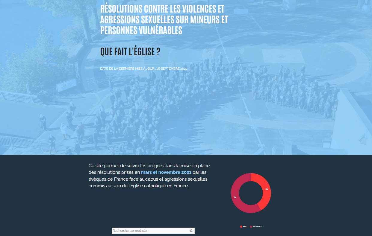 Face aux abus et agressions sexuelles commis au sein de l’Église catholique, en novembre 2021, les évêques de France ont voté une série de mesures visant à enraciner une culture de la vigilance à tous les niveaux, à moyen et long terme. Un site Internet répertorie l’avancée de la mise en place des résolutions prises en mars et novembre 2021.
