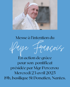 Mercredi soir, 23 avril, Monseigneur Percerou célébrera une messe à l’intention du pape François, en action de grâce pour son pontificat à 19h00 en la basilique Saint-Donatien de Nantes. Conscient que l’ensemble des diocésains ne pourra pas nécessairement se déplacer, Monseigneur Percerou demande que toutes les messes de ce mercredi de l’octave de Pâques soient également célébrées à cette intention.