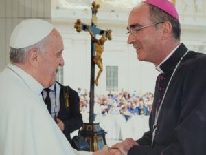 J’ai été le dernier évêque français nommé par le Pape Benoît XVI et le premier évêque ordonné sous le pontificat du Pape François en avril 2013. Je l’ai rencontré trois fois de façon assez brève. En 2013, peu de temps après mon ordination, j’ai participé à Rome à une session des nouveaux évêques. A cette occasion François nous avait invités à ne pas être « des évêques d’aéroport » mais à être pasteurs du peuple de Dieu qui nous avait été confié. Je l’ai revu au cours d’un pèlerinage, puis en octobre 2018, lors du synode sur les jeunes et les vocations. Là, j’ai passé un mois à Rome. J’ai été frappé par la simplicité du Pape qui se trouvait chaque matin à 8h30, avec son porte document, à l’entrée de la salle du synode, saluant simplement ceux qui arrivaient. Le Pape avait déjà du mal à marcher, il prenait l’ascenseur, mais n’aimait pas le faire seul et invitait les évêques qui passaient à ce moment-là à prendre l’ascenseur avec lui… J’ai donc fait un voyage – assez rapide – en ascenseur avec lui… Un moment bref qui m’a permis de bénéficier de sa chaleureuse simplicité !