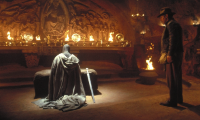 De même, sur l’image tirée d’un film, quand le chevalier gardant le Graal reçoit l’aventurier, les deux manières complémentaires de servir sont présentes : être à genoux et être debout, prier et agir, se retirer du monde et être pleinement dans le monde.
