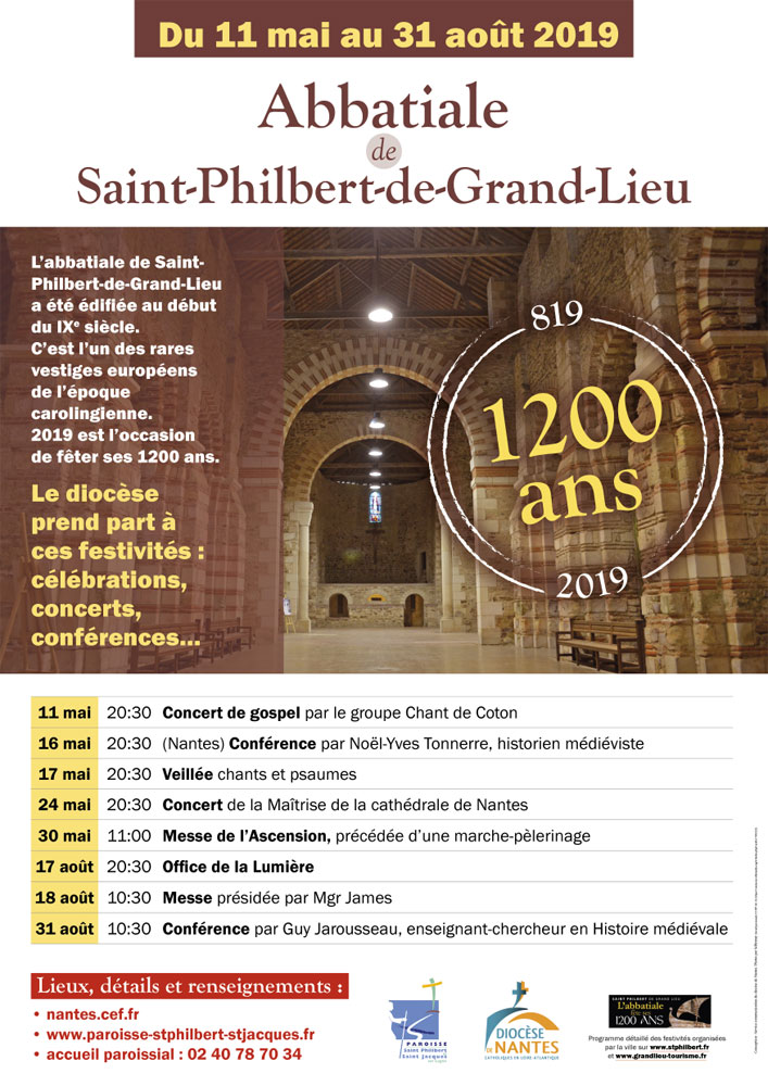 L’abbatiale de Saint-Philbert-de-Grand-Lieu a été édifiée au début du IXe siècle. C’est l’un des rares vestiges européens de l’époque carolingienne et le plus ancien monument classé de Loire-Atlantique. 2019 est l’occasion de fêter ses 1200 ans. Avec la commune et la paroisse Saint-Philibert-et-Saint-Jacques-sur-Logne, le diocèse prend part à ces festivités. De mai à septembre, les temps forts vont se succéder avec au programme : célébrations, concerts, conférences, expositions,…