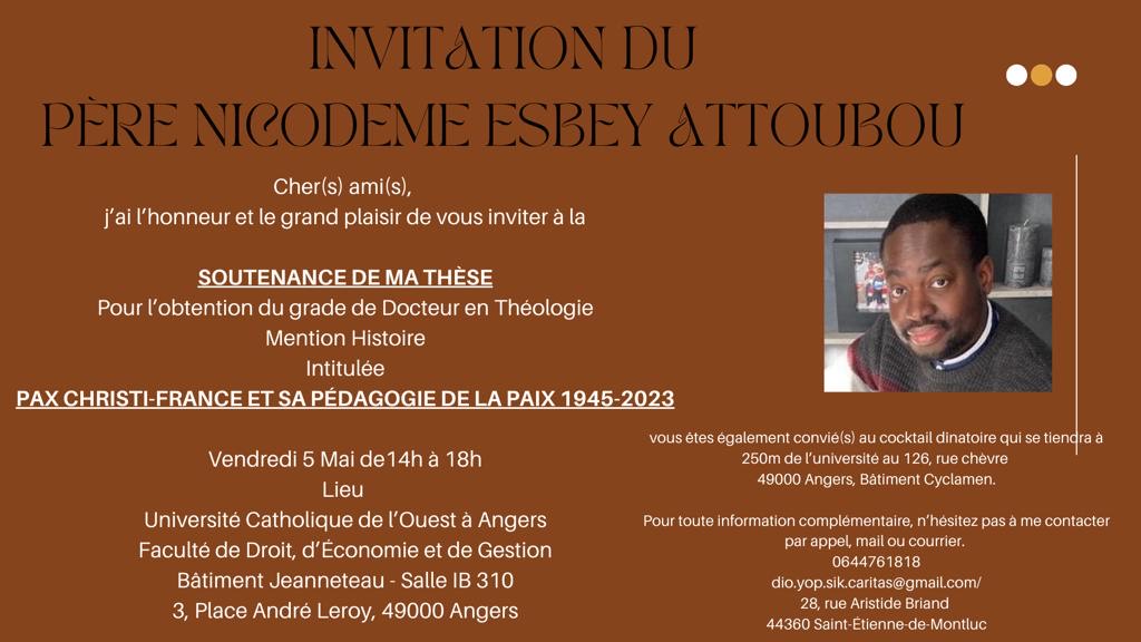 Le père Nicodème Attoubou, administrateur de la paroisse Saint-Luc-de-Bretagne souhaite partager avec le diocèse, la dernière étape d’un long travail sur la Paix. Il soutiendra ce vendredi 5 mai sa thèse de Doctorat en théologie à l’UCO d’Angers. Des paroissiens l’accompagneront face au jury de cinq personnes. Il compte aussi sur nos prières !