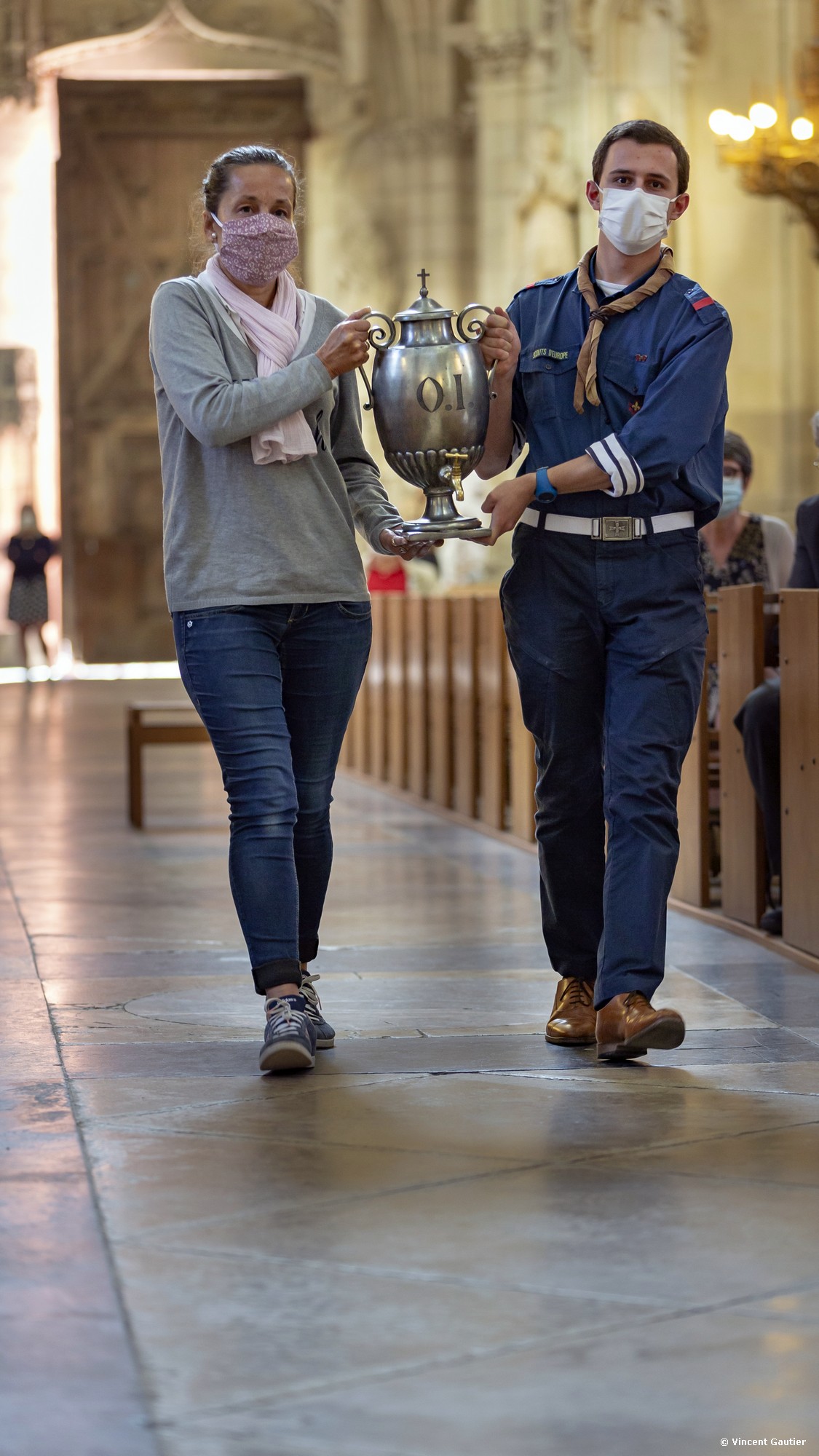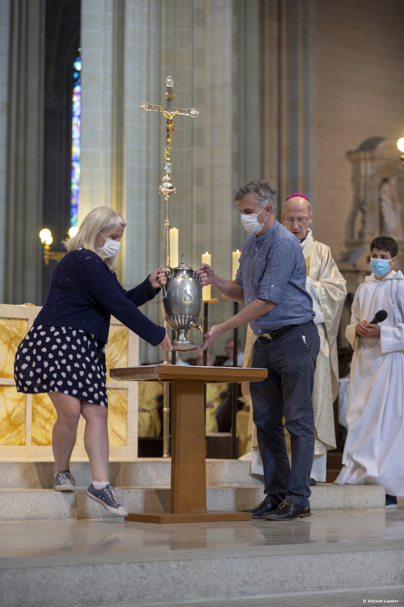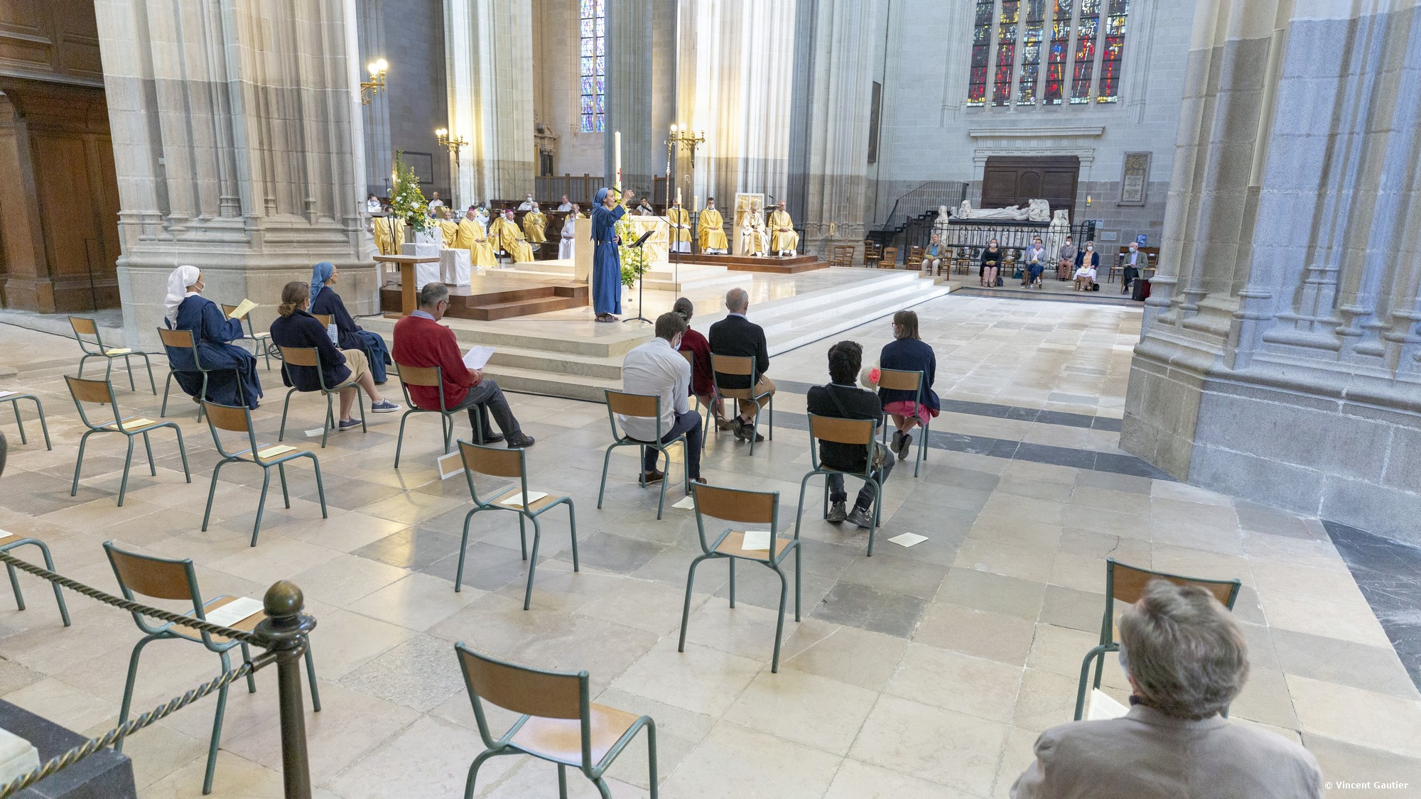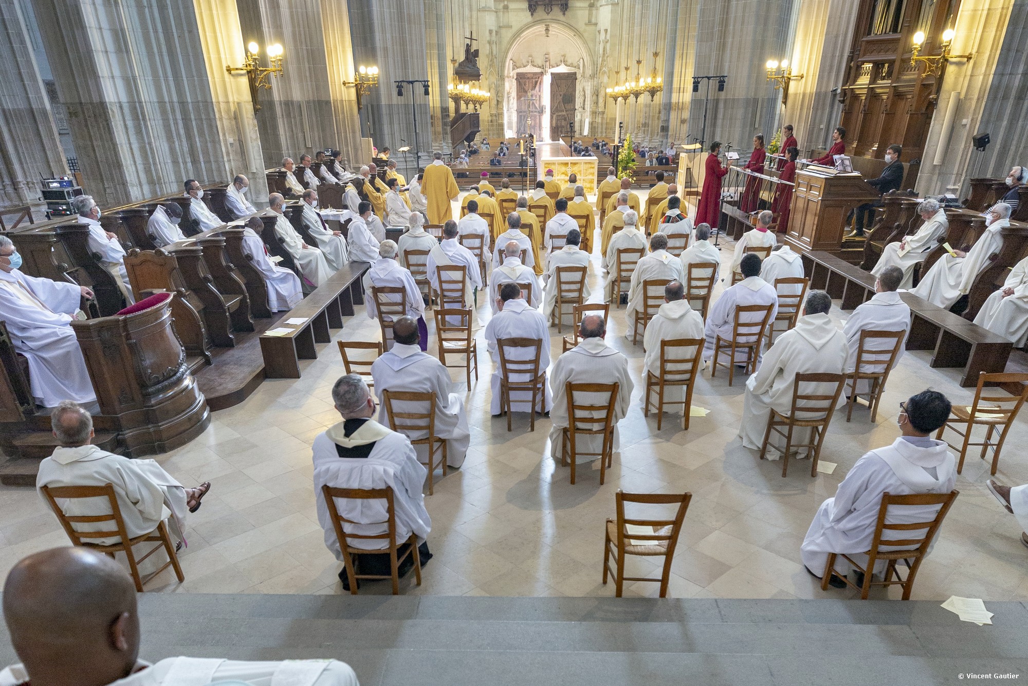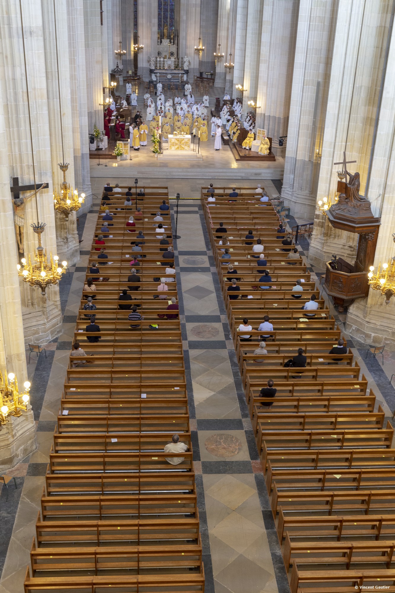 La messe chrismale, reportée du 7 avril au 27 mai, s’est vécue avec une assemblée un peu plus conséquente. Les mesures de précaution sanitaire ont toutefois contraint à limiter strictement le nombre de personnes présentes (prêtres, représentants des paroisses, des services, des congrégations…) Cette messe chrismale a été diffusée sur le site internet du diocèse et sur Radio-Fidélité, afin de vivre un temps de communion diocésaine, autant que les circonstances le permettaient.