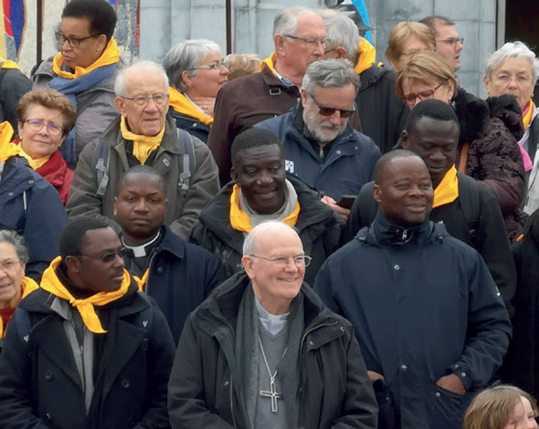 Arrivés sous un grand soleil après 7-8 heures de route, les 70 lycéens venus de tout le diocèse descendent des cars pour regagner le village des jeunes. Amélie, élève en 1re au lycée Talensac, à Nantes, participe à ce pèlerinage pour la sixième fois : « J’ai besoin de revenir chaque année pour me recentrer sur ma foi et sur Dieu, parce que même quand on prie tous les jours, on n’est jamais aussi concentré sur Lui (qu’ici) », confie-t-elle au micro de Radio Fidélité. Chaque catégorie d’âge a un programme qui lui est propre même si des temps sont partagés comme cet après-midi consacré au sacrement de réconciliation. Le premier matin (mardi), tout le diocèse se retrouve à la grotte pour une messe d’ouverture qui compte de nombreux pèlerins. Mgr James qui est sur place depuis la semaine précédente (puisque l’Assemblée plénière se tenait également à la cité mariale), constate qu’« en une semaine, le visage de Lourdes change  beaucoup ». En effet, en plus des 1300 pèlerins venus de Loire-Atlantique, d’autres diocèses comme ceux de Tours ou de Lille sont à Lourdes cette même semaine. Messe à la grotteL’occasion d’un double renouveau Pour Mgr James, ce pèlerinage est l’occasion d’un « double renouveau » ; tout d’abord pour se fortifier dans la foi, alors que l’Église connaît une période difficile. Pour cela, Mgr James invite à suivre l’exemple de Bernadette qui a « traversé des moments durs dans sa vie mais qui a tenu  dans la foi ». Et aussi, un renouveau dans la fraternité, « par le fait de se trouver à l’extérieur de nos maisons, en dehors de nos repères habituels, et de vivre un temps communautaire ». Paul Martin, hospitalier qui accompagne depuis de nombreuses années les malades à tous les pèlerinages organisés par le diocèse (avril et juillet), témoigne de « beaucoup de joie et beaucoup de partage », à la fois avec les malades qu’il est là pour servir mais aussi avec les autres  hospitaliers ; « nous  sommes une famille au service des malades du diocèse ».