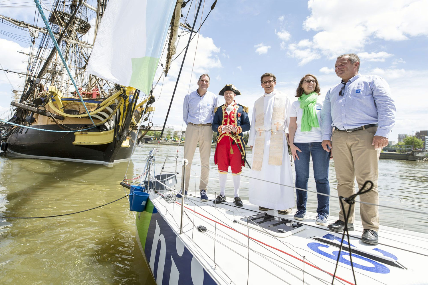 Lundi après-midi (27 mai 2019), quai de la Fosse à Nantes, le voilier « Niji » du skipper Gildas Morvan a été béni en présence de Yann Cariou, Commandant de L’Hermione, le parrain. Le père Édouard Roblot, Aumônier des étudiants et prêtre de la paroisse Notre-Dame-de-Nantes a béni le bateau et ceux qui navigueront dessus. Gildas Morvan, originaire de Camaret, en avait fait la demande, touché par les mises à l’eau et bénédiction de bateaux dont il avait souvenir dans son enfance et qui rassemblaient tout le village… A cette occasion, Le père Roblot lui a remis, une veilleuse de Notre-Dame-de-Rocamadour, patronne des marins… Une dévotion partagée par la maman de Gildas Morvan à chacun des départs de course de son fils.